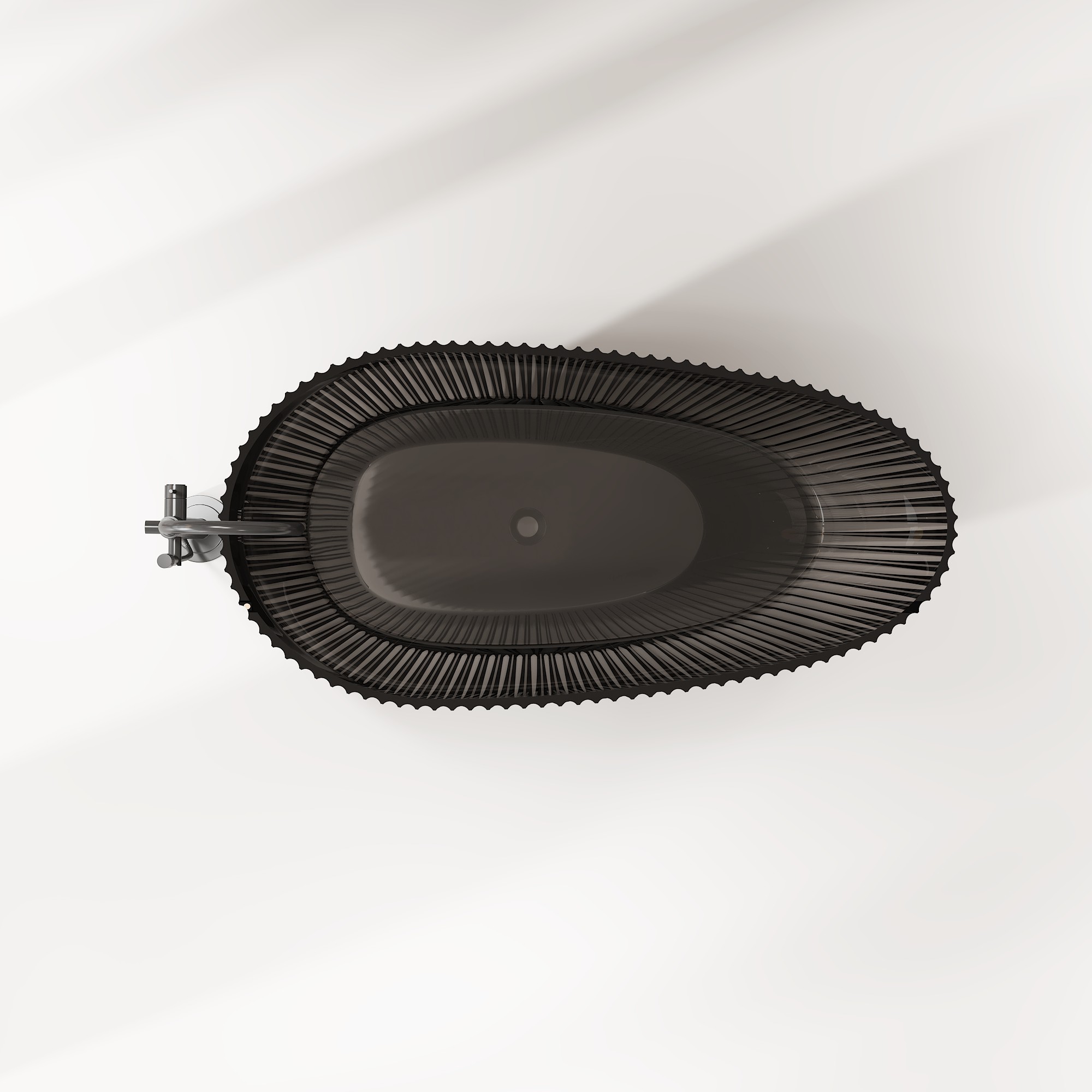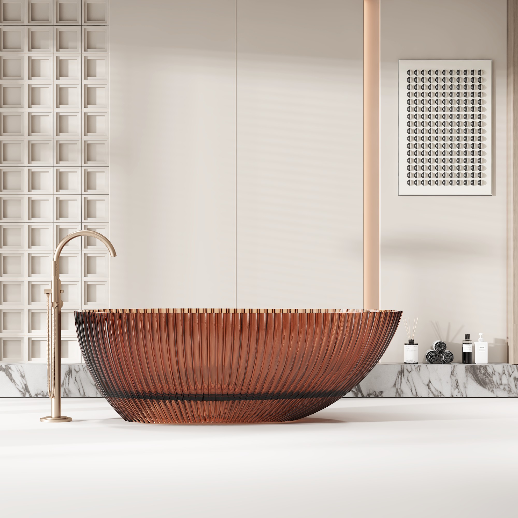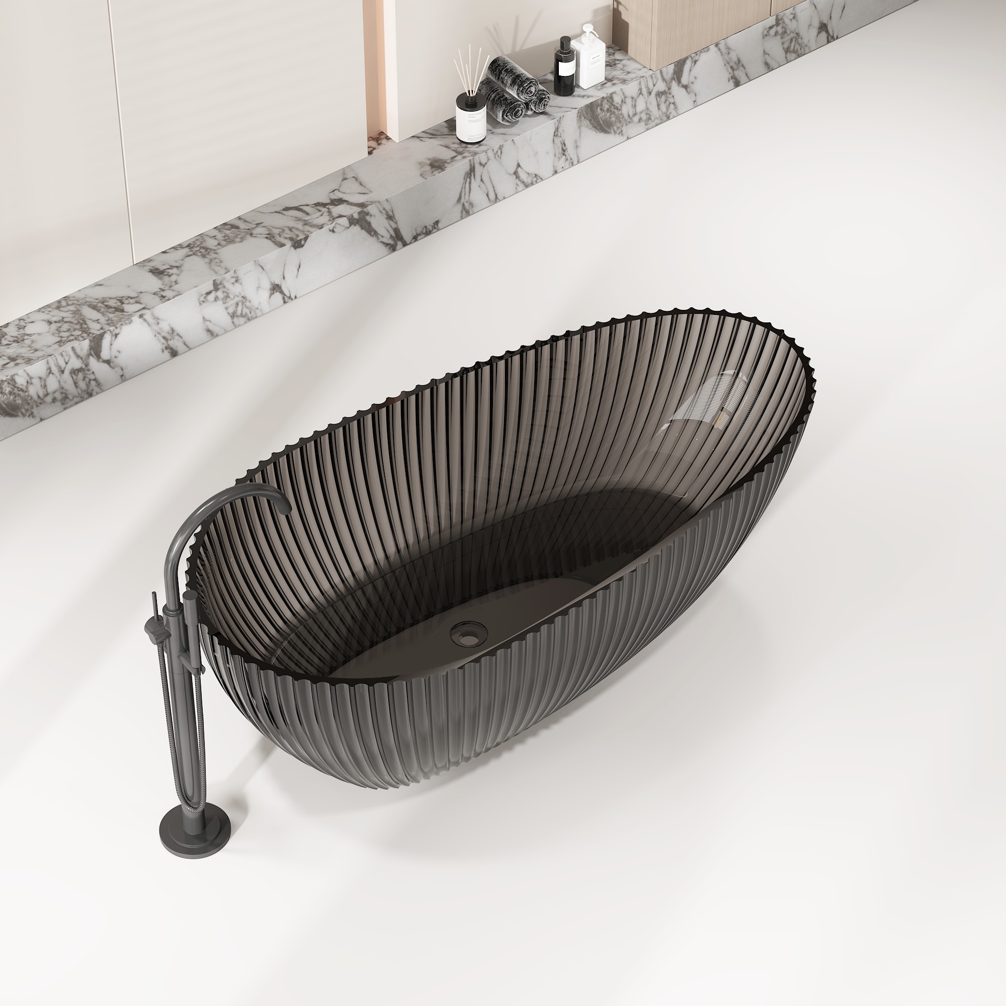 Crafted from a homogeneous, non-porous solid resin composite, our transparent bathtub features a bold, organic oval silhouette with a distinctive ribbed texture that mimics natural water movement. The deep, ergonomically contoured interior provides full-body immersion, while the lightweight yet robust construction simplifies installation, making it ideal for both new builds and renovations. Available in a range of stunning translucent finishes—from deep smoky gray and warm amber to rich ocean blue (as showcased in our imagery)—this tub’s surface captures and refracts light, creating a dynamic, ever-changing appearance that elevates any interior style, from minimalist modern to avant-garde luxury.