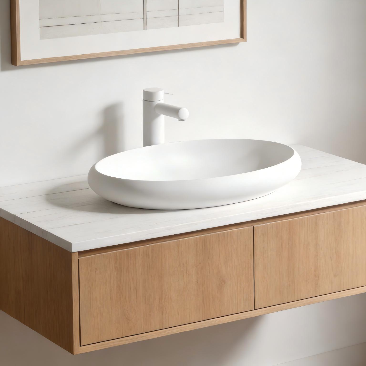 Sleek Organic Design: The Corian top wash basin features a unique, organic oval shape with soft, flowing curves, creating a bold, artistic focal point that elevates any bathroom vanity. Its understated elegance complements a wide range of interior styles, from modern minimalism to industrial chic.