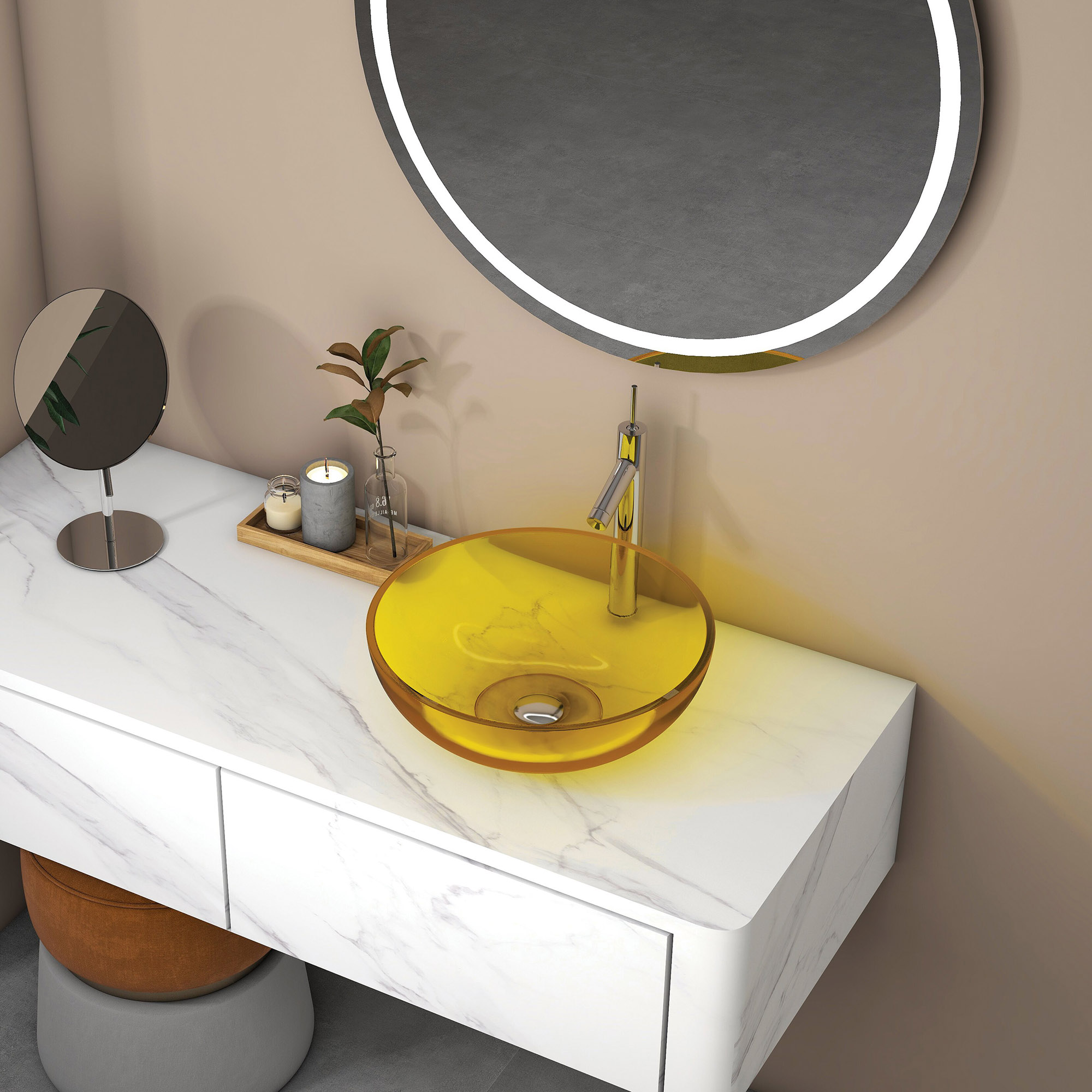 Timeless Round Bowl Silhouette: The classic round bowl shape embodies understated luxury, with smooth, curved edges that merge modern minimalism with organic warmth. Its compact, sculptural form makes it a versatile centerpiece for powder rooms, guest bathrooms, and high-end residential ensuites.