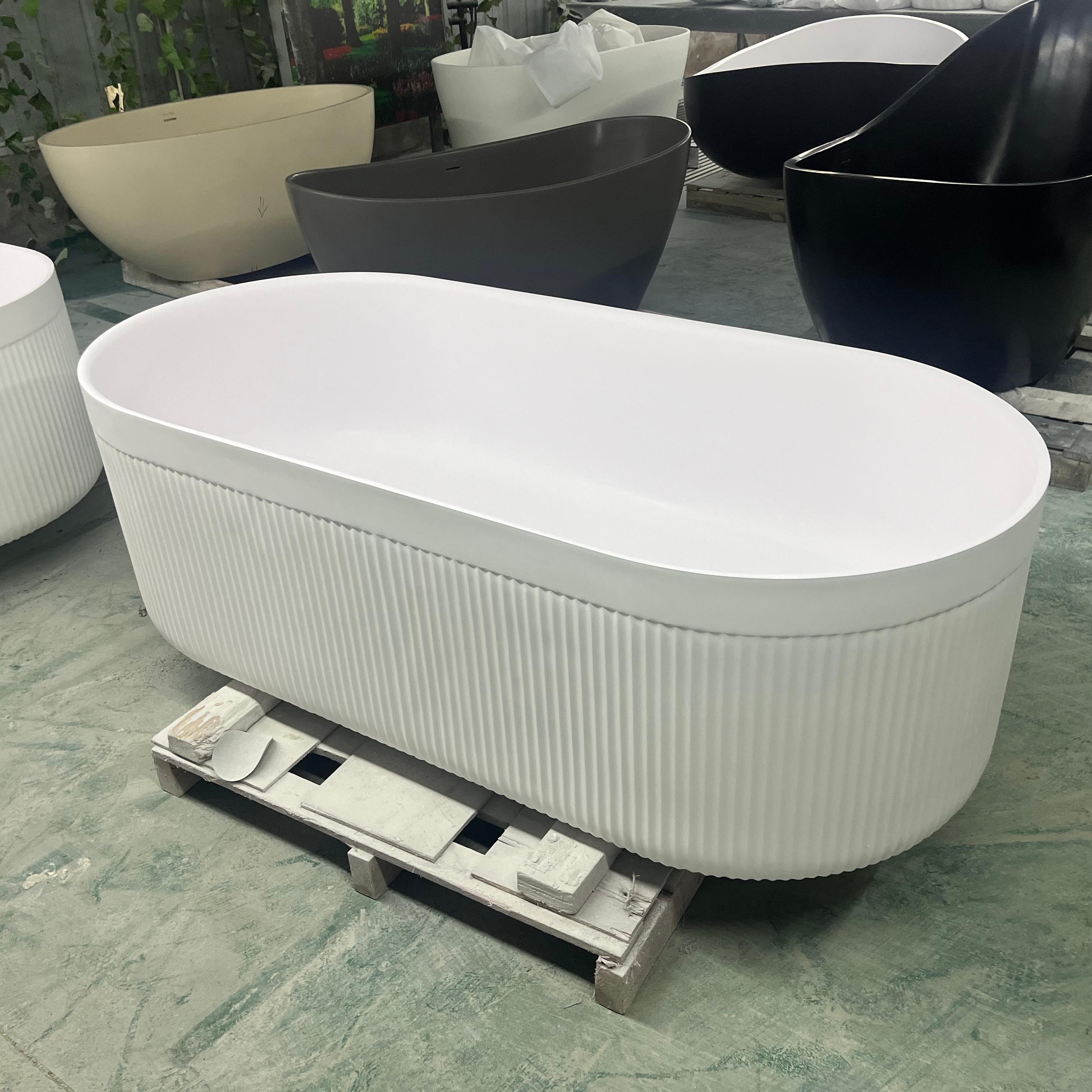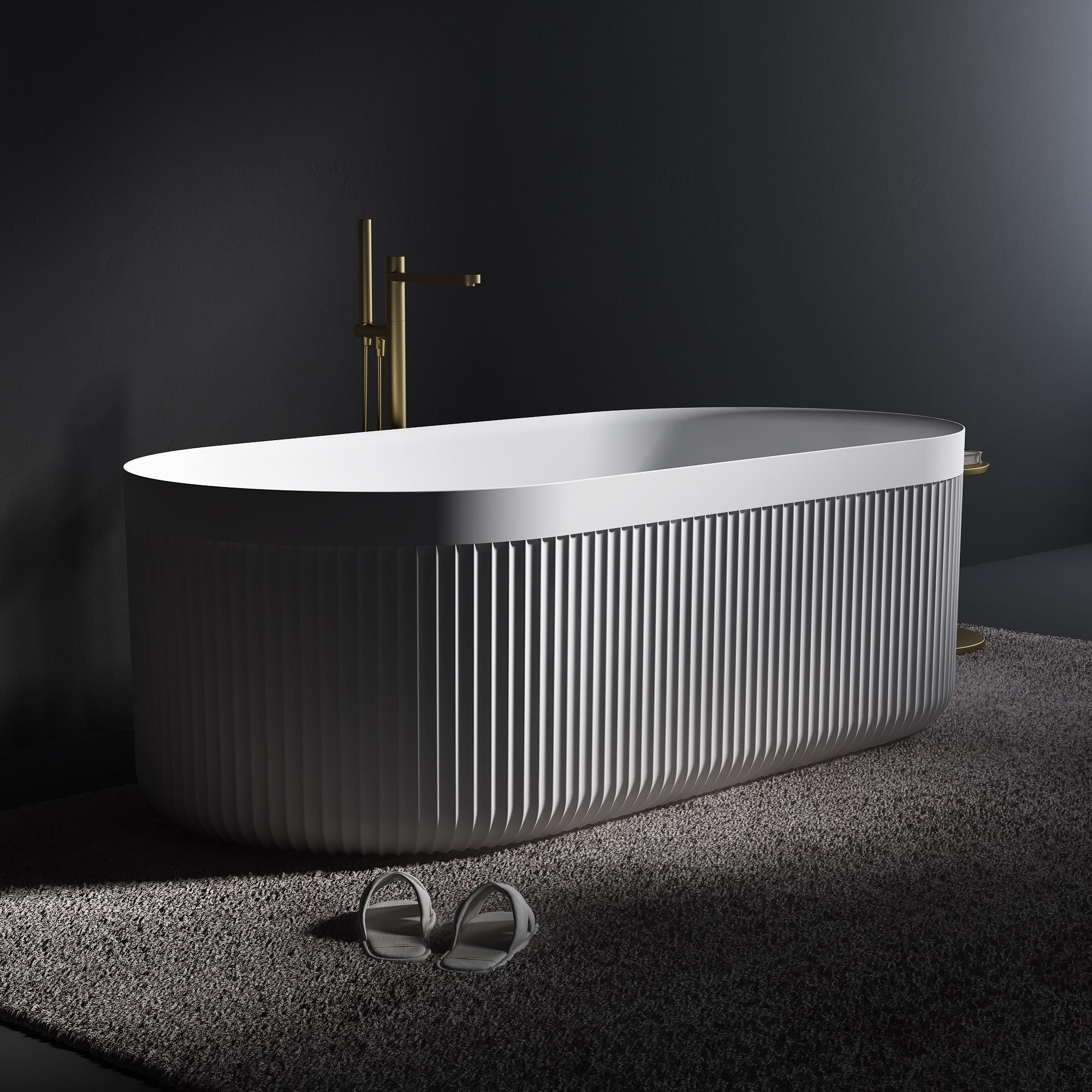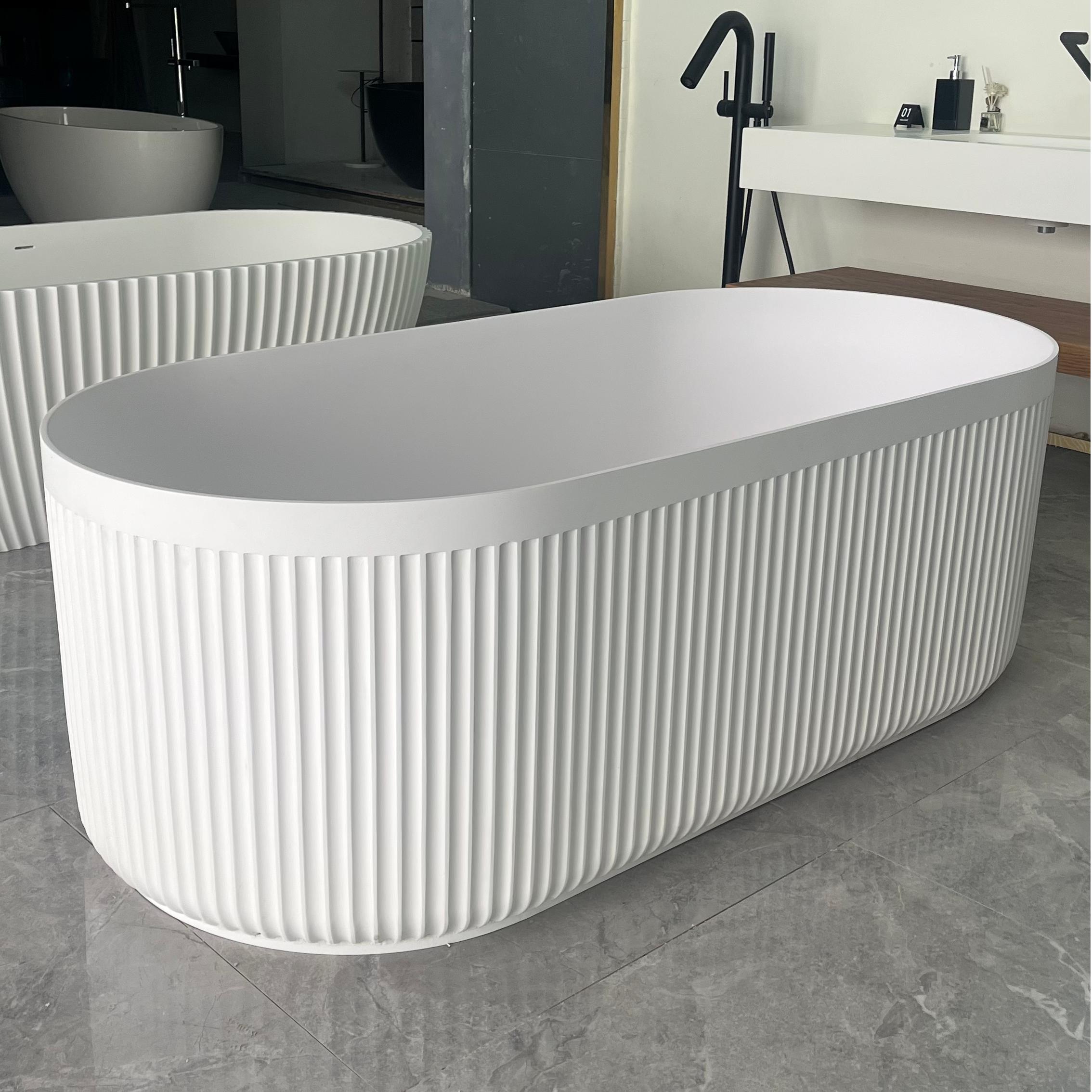 Designed as a bold focal point, these Krion bathtubs feature a striking vertical ribbed exterior that adds depth and architectural interest to any space, from minimalist contemporary bathrooms to luxury boutique hotel suites. The seamless one-piece construction—hallmark of Krion craftsmanship—eliminates joints and crevices, preventing mold, mildew, and bacteria growth while ensuring a flawless, velvety finish that resists stains, scratches, and discoloration. Unlike acrylic or traditional stone, Krion retains its matte white (or custom) finish for decades, even with daily use, and withstands thermal shock, making it ideal for both residential and high-traffic commercial applications.