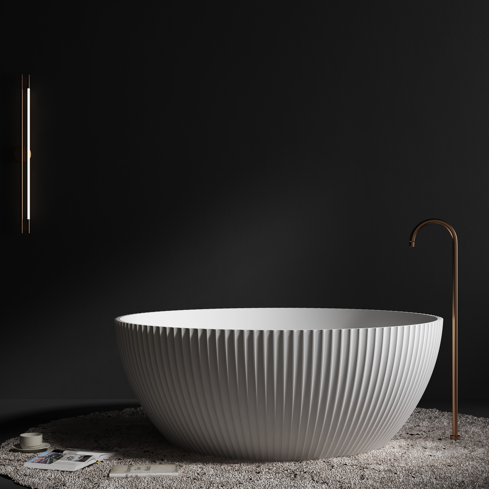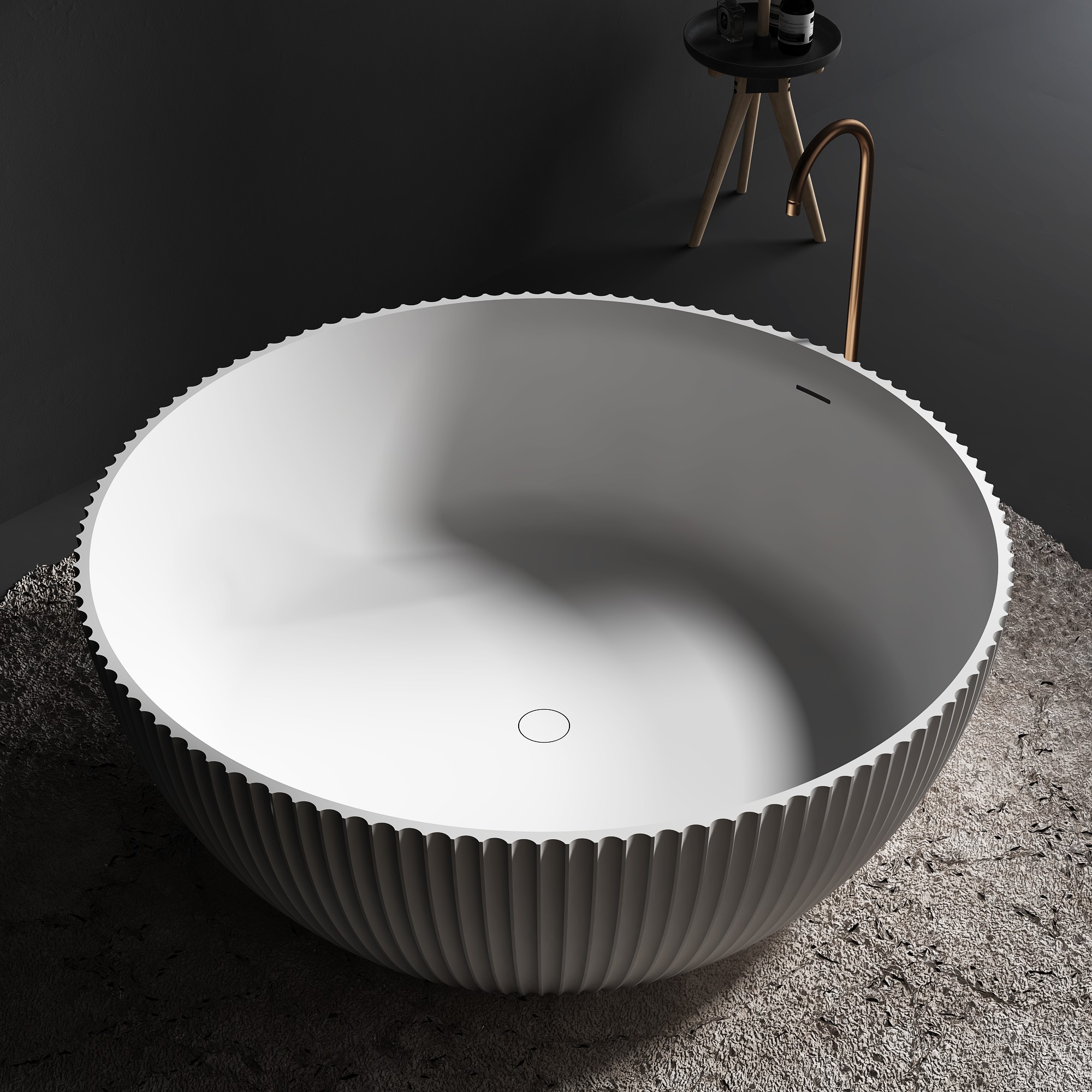 Crafted from a homogeneous, non-porous solid stone composite, our round soaking tub features a striking fluted exterior with vertical ridges that add texture and depth, while the seamless, smooth interior provides a clean, inviting surface. The deep, ergonomically contoured basin offers ample space for full-body immersion, and the lightweight yet sturdy construction simplifies installation, making it ideal for both new builds and renovations. Whether finished in a crisp, timeless white or a dramatic matte black (as showcased in our imagery), the tub’s versatile design complements any interior style.