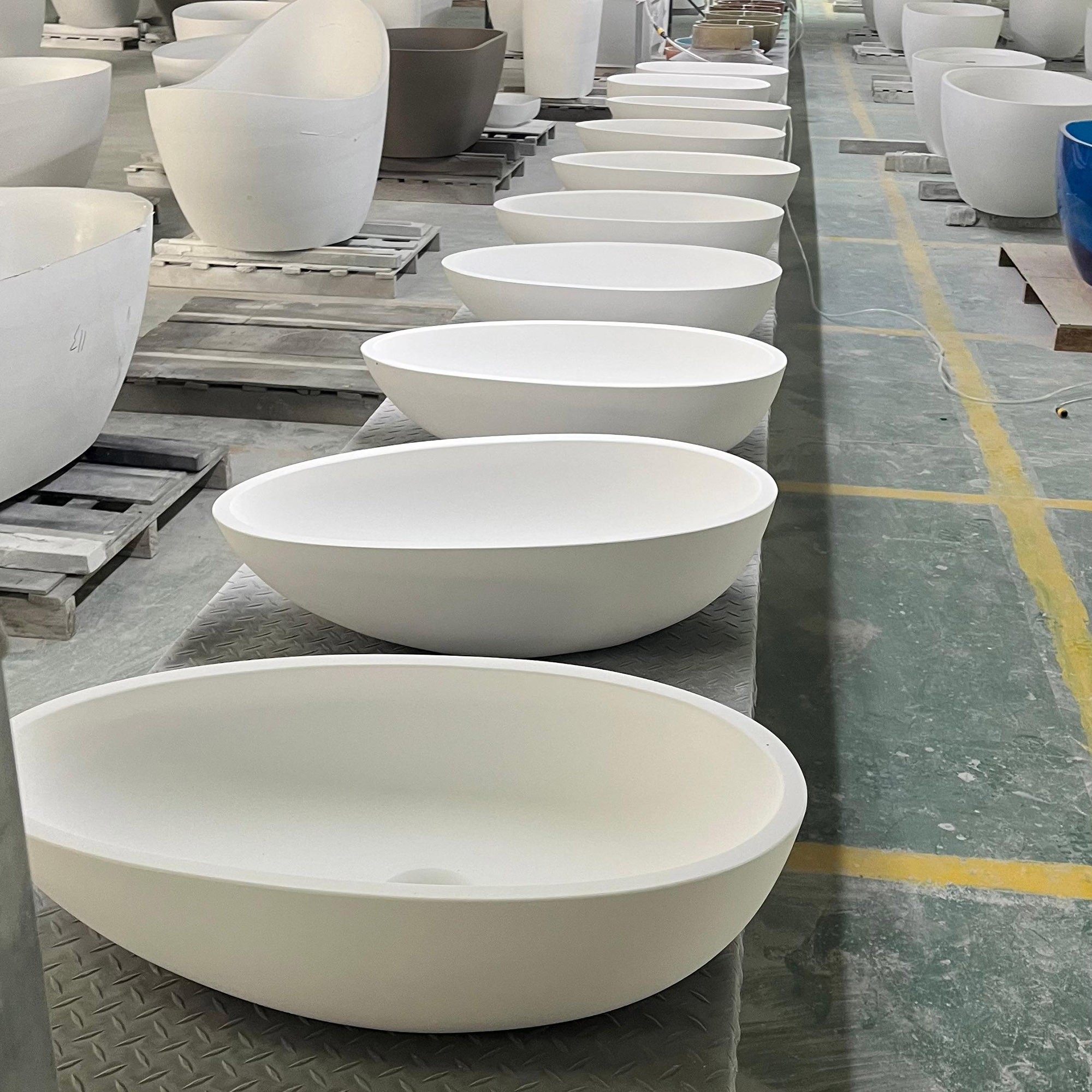 Cohesive Bathroom Suite: Designed to perfectly match our boat-shaped bathtubs, this sink creates a unified, high-end aesthetic that ties the entire bathroom space together. The matching shape and material ensure a seamless, luxurious look that is both visually striking and functionally cohesive.