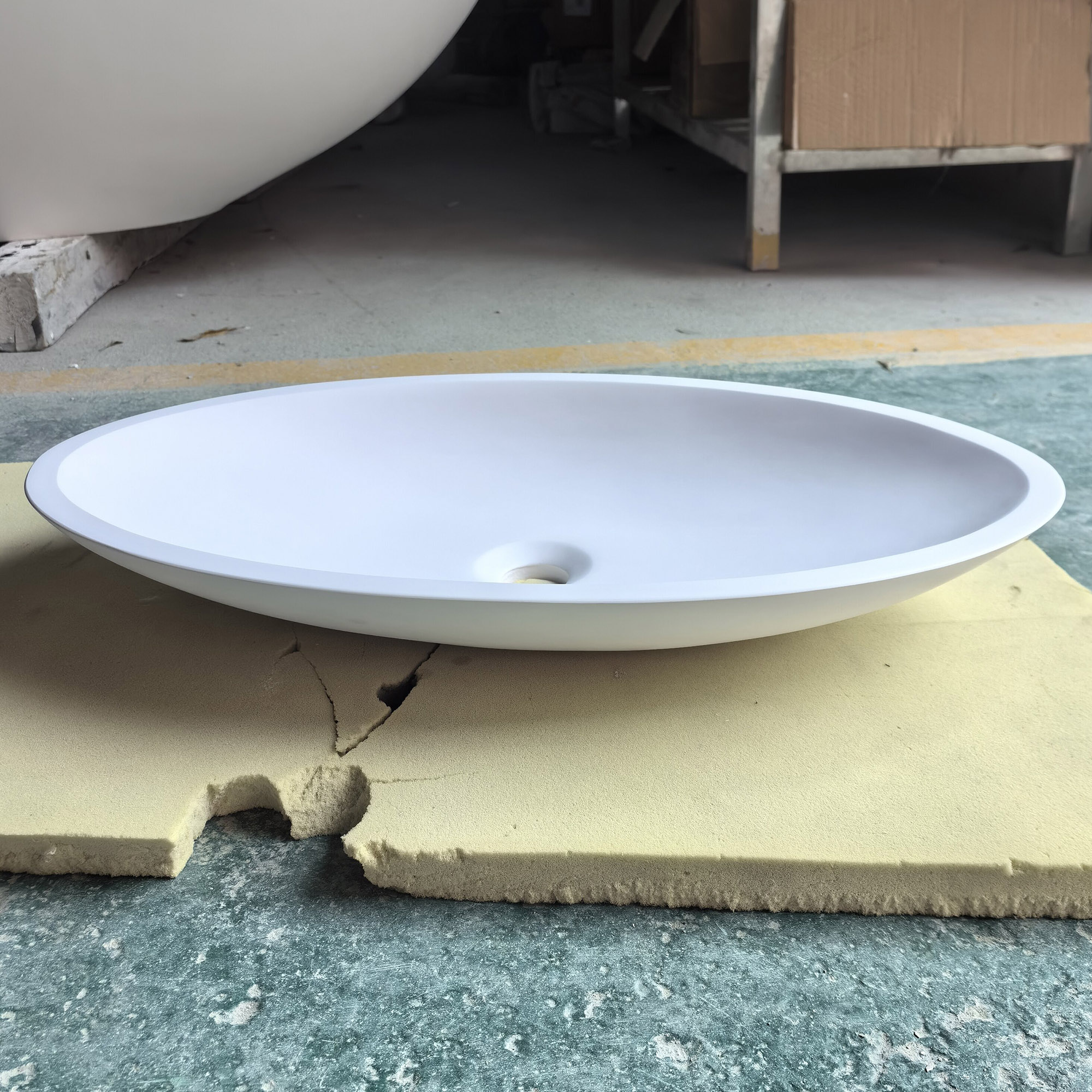 Sleek Organic Design: The Corian top wash basin features a unique, organic oval shape with soft, flowing curves, creating a bold, artistic focal point that elevates any bathroom vanity. Its understated elegance complements a wide range of interior styles, from modern minimalism to industrial chic.