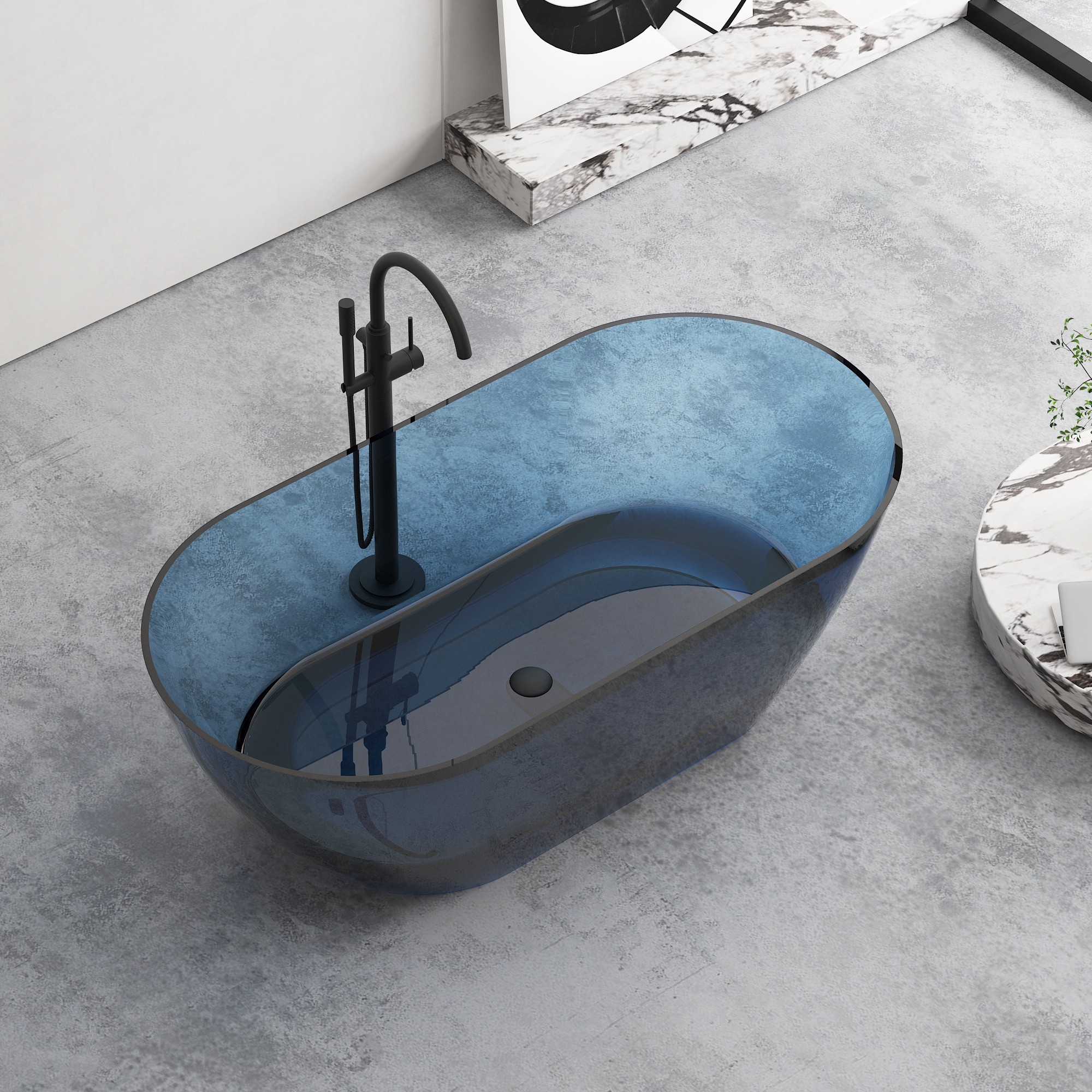 Crafted from a homogeneous, non-porous solid crystal composite, our transparent tub features a seamless, organic oval shape with clean, flowing lines. The deep, ergonomically contoured interior provides full-body immersion, while the lightweight yet sturdy construction simplifies installation, making it ideal for both new builds and renovations. Available in a range of stunning finishes—from warm amber and rich rose gold to deep smoky gray (as showcased in our imagery)—this tub’s translucent surface captures and refracts light, creating a dynamic, ever-changing appearance that elevates any interior style, from minimalist to industrial-chic.